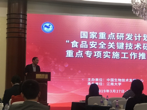 3月28日,由中国生物技术发展中心主办,江南大学承办的国家重点研发计划“食品安全关键技术研发”重点专项实施工作推进会在江苏无锡召开。中国生物技术发展中心副主任范玲,科技部社会发展科技司陈欣,科技部资源配置与管理司张庆梓,国家科技风险开发事业中心副处长刘军,科学技术部科技经费监管服务中心副处长周丽滔、江苏省及江南大学专家领导、近三年项目负责人等300余人参加大会。推进会开幕式由中国生物技术发展中心工业生物技术处处长付卫平主持。暨南大学校长助理王志伟教授出席会议,汇报了“进口新型食品接触材料检测与风险评估技术研究”项目研究情况。