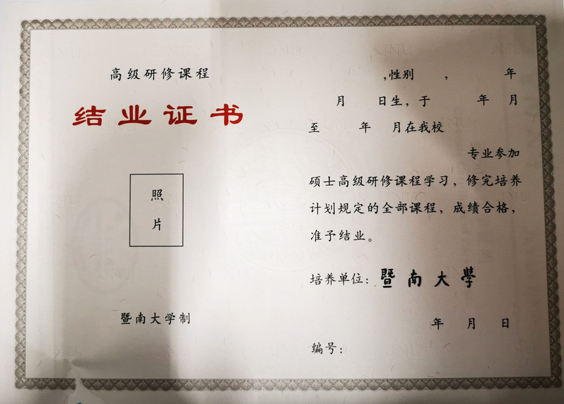 1.学员修读全部课程且合格者,可获《暨南大学高级研修课程结业证书》;修读部分课程且合格者,可获《暨南大学高级研修课程修读证明》。