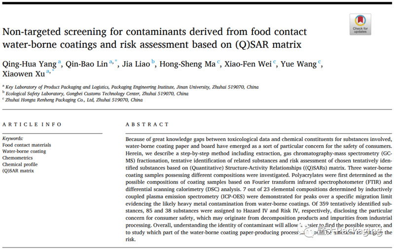 近日,成人a片 徐晓文副教授和林勤保研究员指导的硕士二年级学生杨青华为第一作者完成的研究论文 Non-targetedScreening for Contaminants derived from Food ContactWater-borne Coatings and Risk Assessment Based on (Q)SAR Matrix 在国际著名期刊 Food Packaging and Shelf Life(影响因子=8.7,SCI 一区)正式发表。该刊物为食品安全领域国际顶尖杂志,在国际食品安全研究领域有重要影响。该文章获得广东省基础与应用基础项目,以及珠海市进出口公共技术服务平台产学研协同创新项目的资助。