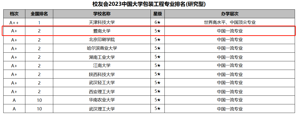 5月10日,全国第三方大学评价机构艾瑞深校友会网正式发布《校友会2023中国大学包装工程专业排名(研究型)》榜单,这是该机构连续第9年发布校友会中国大学一流专业排名。暨南大学包装工程专业全国排名第二,是A+专业。成人a片 的综合办学实力、人才培养水平与社会影响力持续提升。